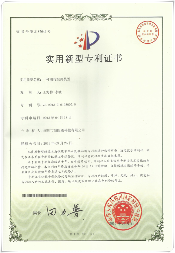 慧眼通油耗检测装置是深圳市慧眼通科技有限公司采用全新理念而自主研发的一套汽车油耗检测系统,目前已取得国家知识产权局的专利认证(专利号:ZL 2013 2 0198005.0)。