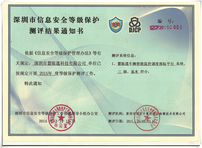 月,深圳市慧眼通科技有限公司的《车辆智能监控调度部标平台》正式通过深圳市信息安全等级测评,并在深圳市公安局备案。